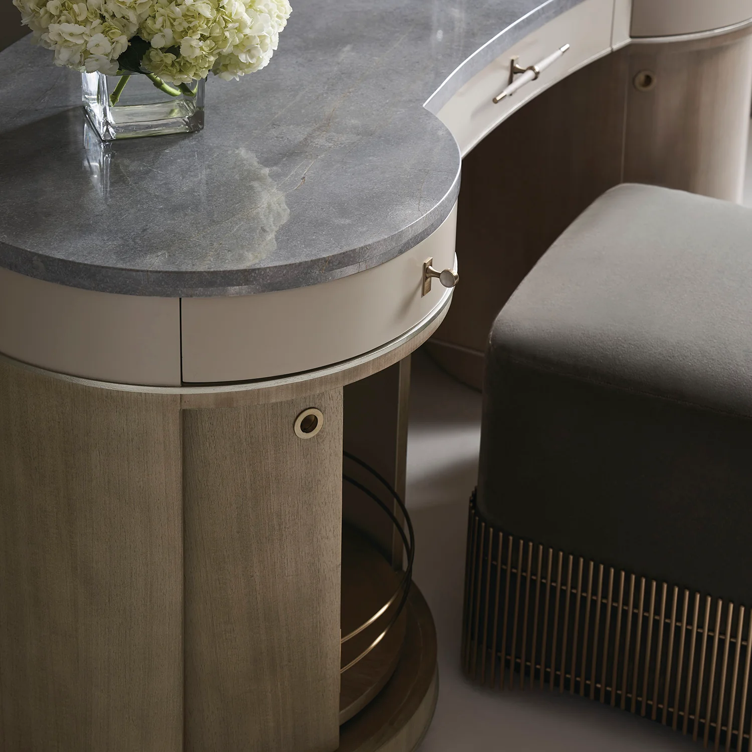 - Exposed metal trim on base finished in Brushed Gold and exposed wood in Dark Chocolate.