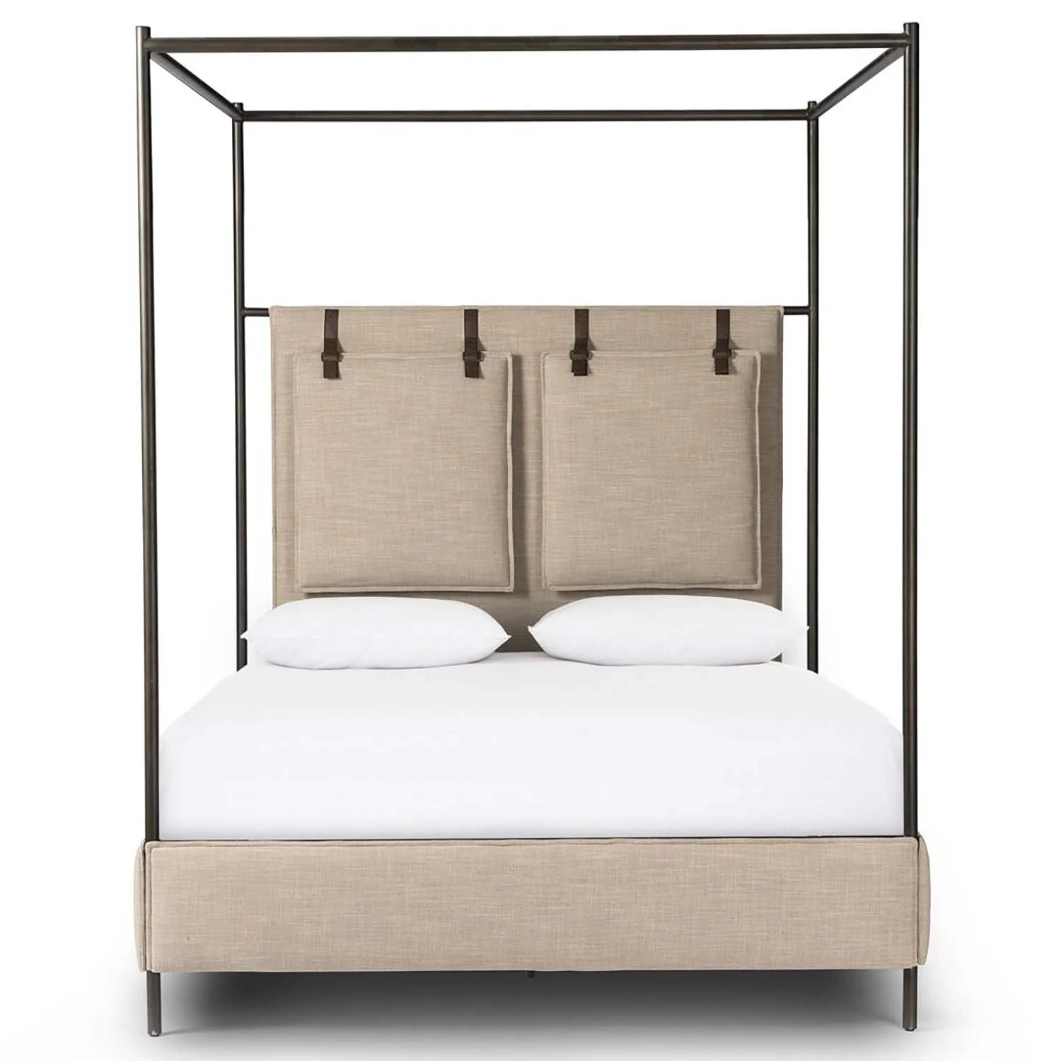 Safari styling gets refreshed with modern-minded high-performance fabric. Leather straps secure decorative suspended headboard pillows. Box spring required. This bed is not compatible with an adjustable mattress.