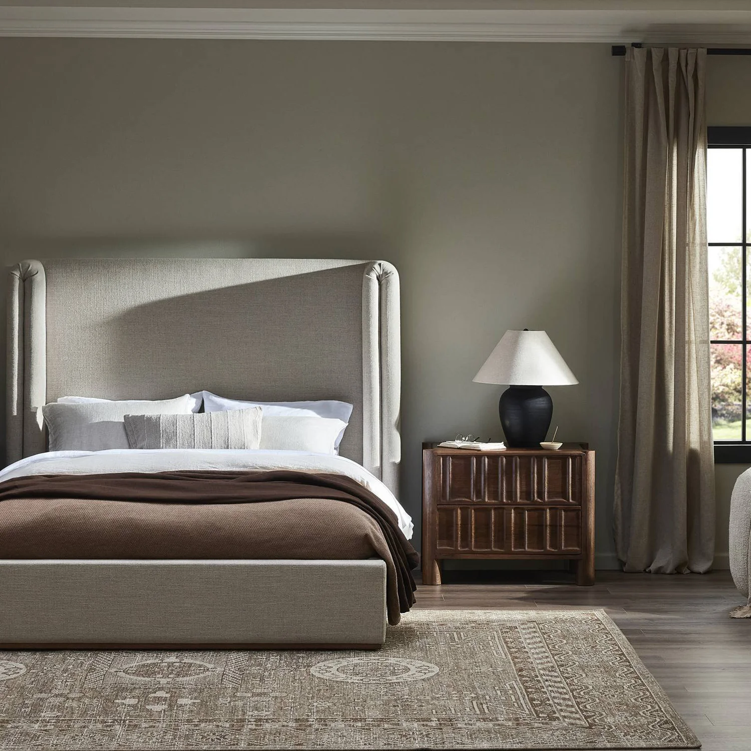 A fold-over detail accentuates a shelter-style headboard, covered in soft taupe fabric, while a wooden plinth base reveals natural graining for a clean, grounded aesthetic.