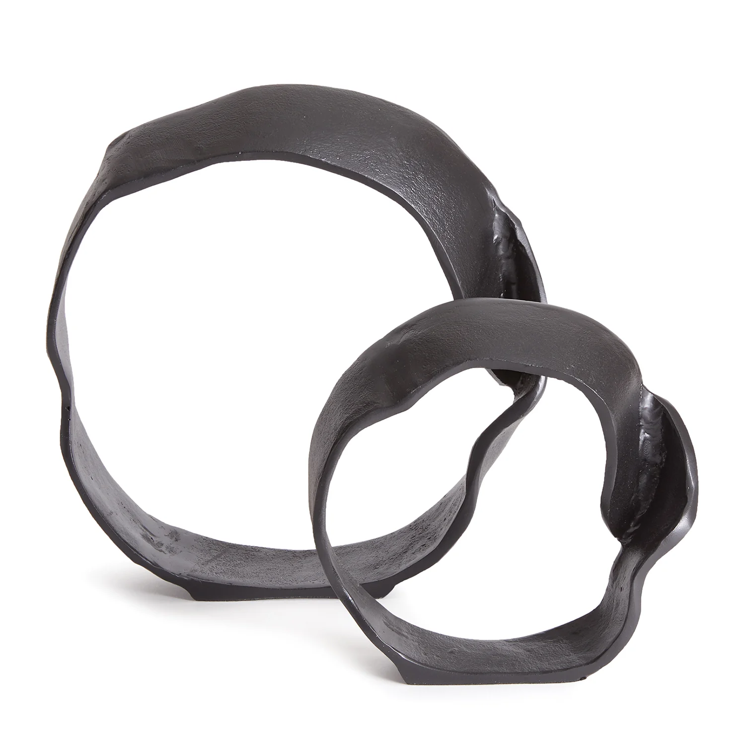 A matte black finish and rough, organic repeated circular shapes make these cast aluminum sculptures unique. A contemporary touch for home office or den on a bookshelf, mantle or console.