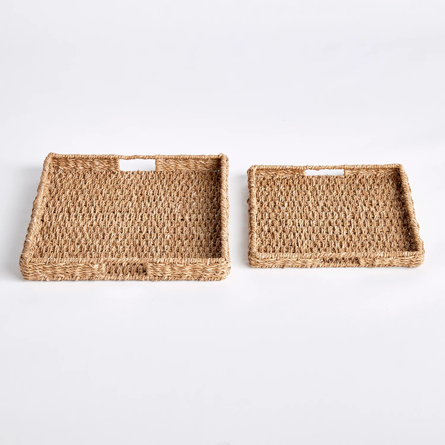 Seagrass is naturally supple, not stiff. Beautiful in color as well as texture. This rectangular set of trays is solidly constructed with an iron frame to keep it's shape. A nice complement to a tall fau x stem.