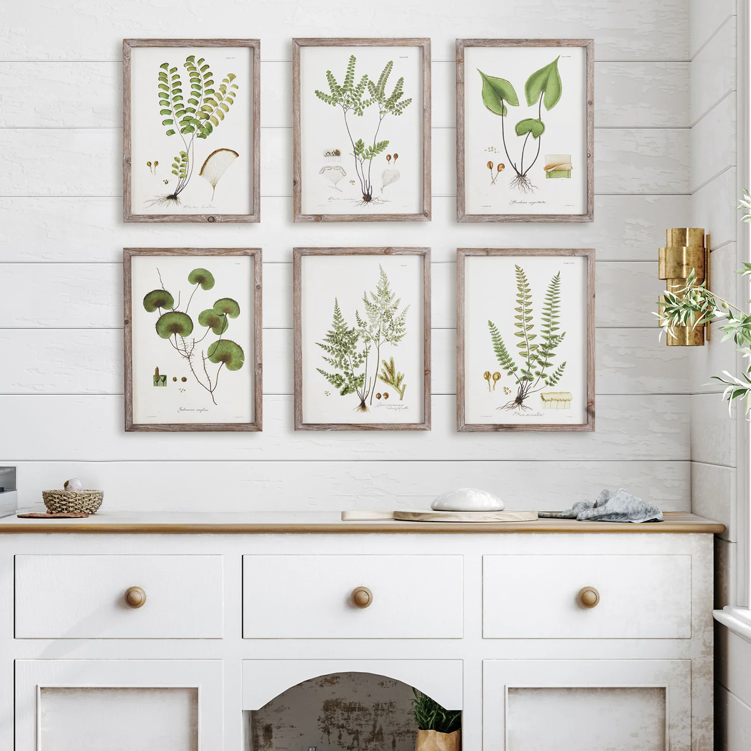 This set of wildly diverse and unusual garden greens is a handsome collection. Finished off with simple, whitewashed wood frames, a beautiful way to furnish home office, study or entry.