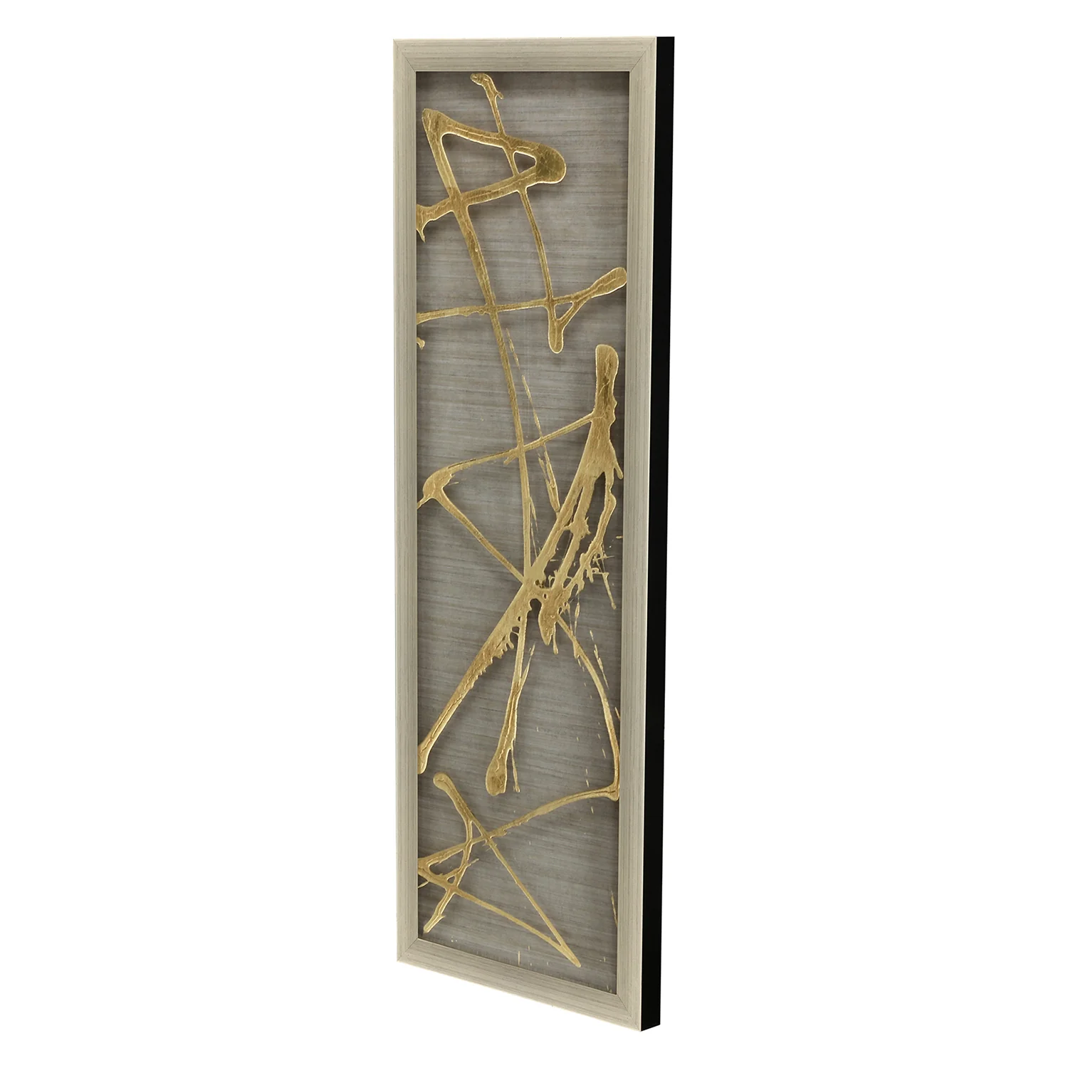 Exclusive mixed media with a reverse hand painted gold leaf glass overlay. Framed in a modern antique silver wood with champagne wash and black side.