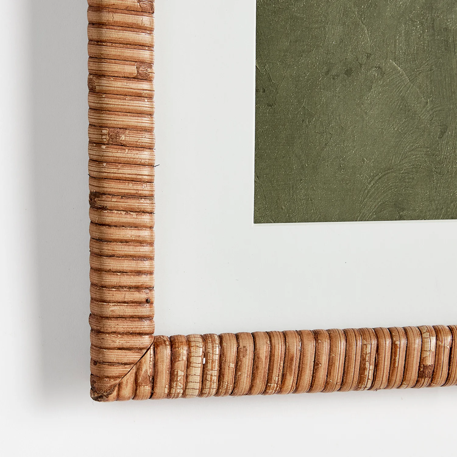 In a rich olive tone, these assorted stem prints are a play on positive and negative space. Bold in scale, with a contemporary composition, this set of prints is finished off with real mats and rattan wrapped frames.