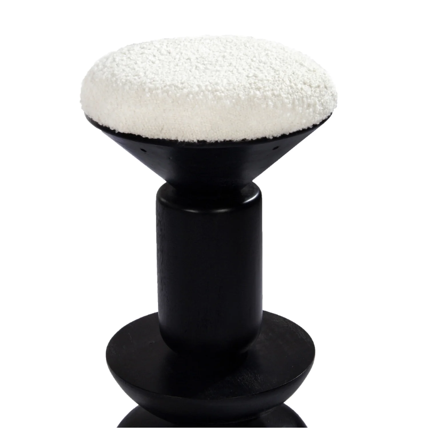 Playful in form, the Kebab bar stool makes a bold, geometric statement. A turned, solid wood upright with an integrated footrest, is topped by a plush, boucle upholstered seat cushion.