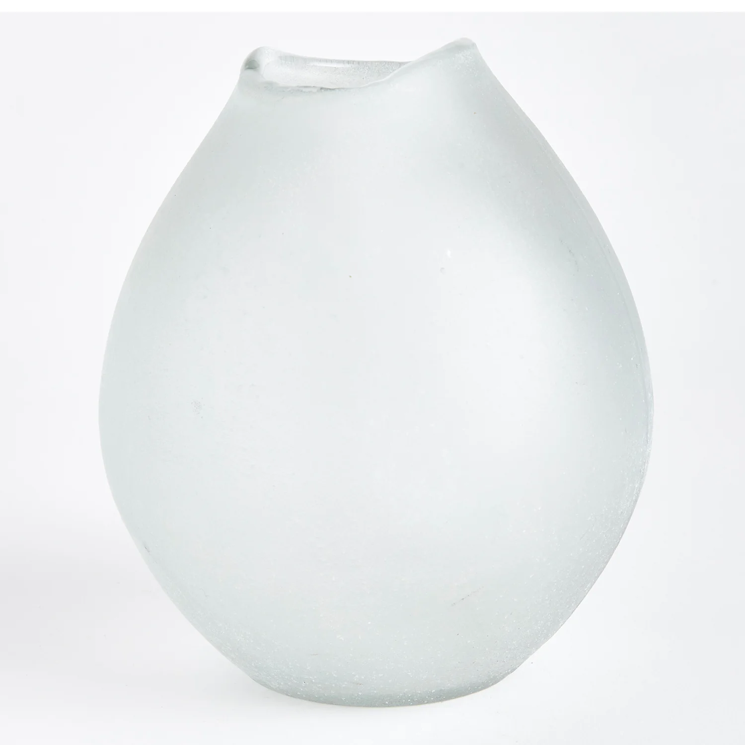 Nature-inspired, this hand blown glass vase has a bulbous shape and melted edge rim detail. The frosted glass only adds to its appeal. A beautiful addition to bookshelf, mantel or side table.