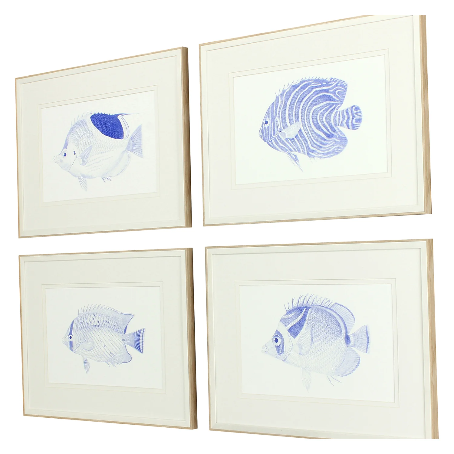 Vintage blue fish are double-matted in white. Framed in a ribbed white wood with blonde wood finish side.